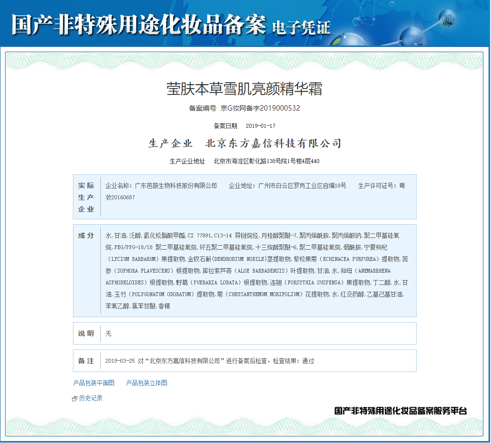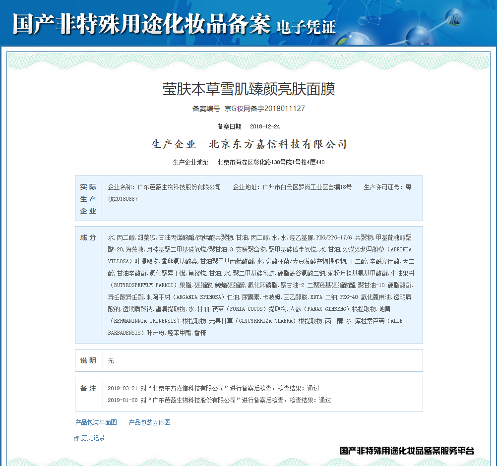 莹肤本草雪肌臻颜亮肤面膜 检测报告